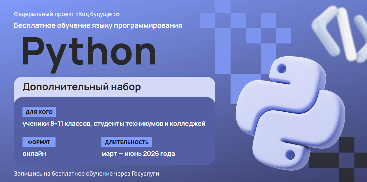 Стартовал дополнительный набор на онлайн-курс программирования на Python. Образовательная платформа Учи.дома приглашает учащихся 8–11 классов бесплатно (за счёт государственной субсидии) присоединиться к обучению. Продолжительность курса — 145 академических часов. Количество мест ограничено.
