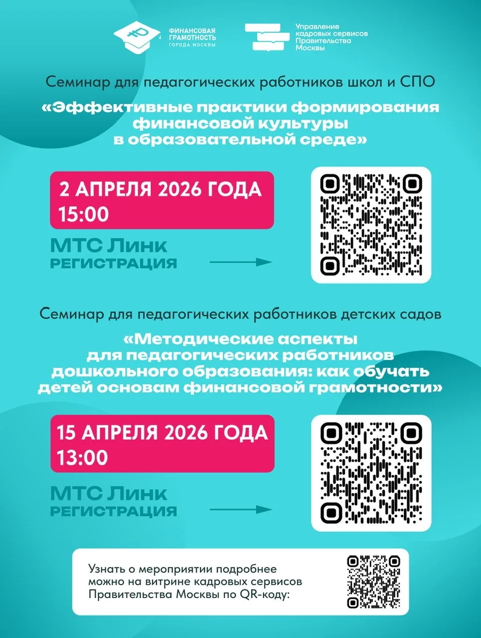 🔸15 апреля в 13:00 — семинар «Методические аспекты для педагогических работников дошкольного образования: как обучать детей основам финансовой грамотности» — для воспитателей детских садов. Регистрация по ссылке.